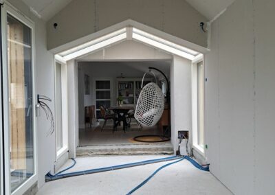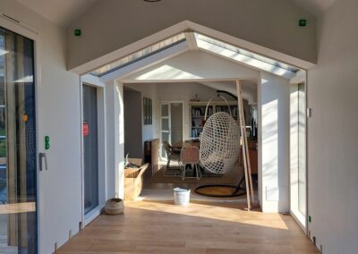 Les grandes ouvertures au sud et en angle jouent un rôle central dans le projet. Elles laissent entrer largement la lumière et installent une relation directe avec le jardin et la terrasse. Le nouveau salon devient alors un espace de transition autant qu’un espace de séjour, où l’on profite à la fois du confort intérieur et de l’ouverture vers l’extérieur. Le projet révèle ainsi les qualités de la maison existante tout en l’ouvrant à de nouveaux usages, plus fluides, plus lumineux et plus ancrés dans le paysage proche.