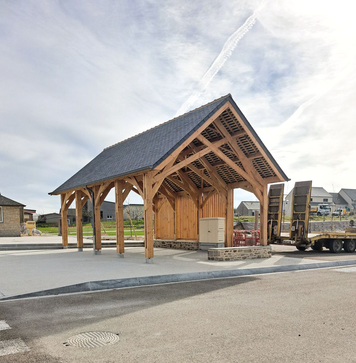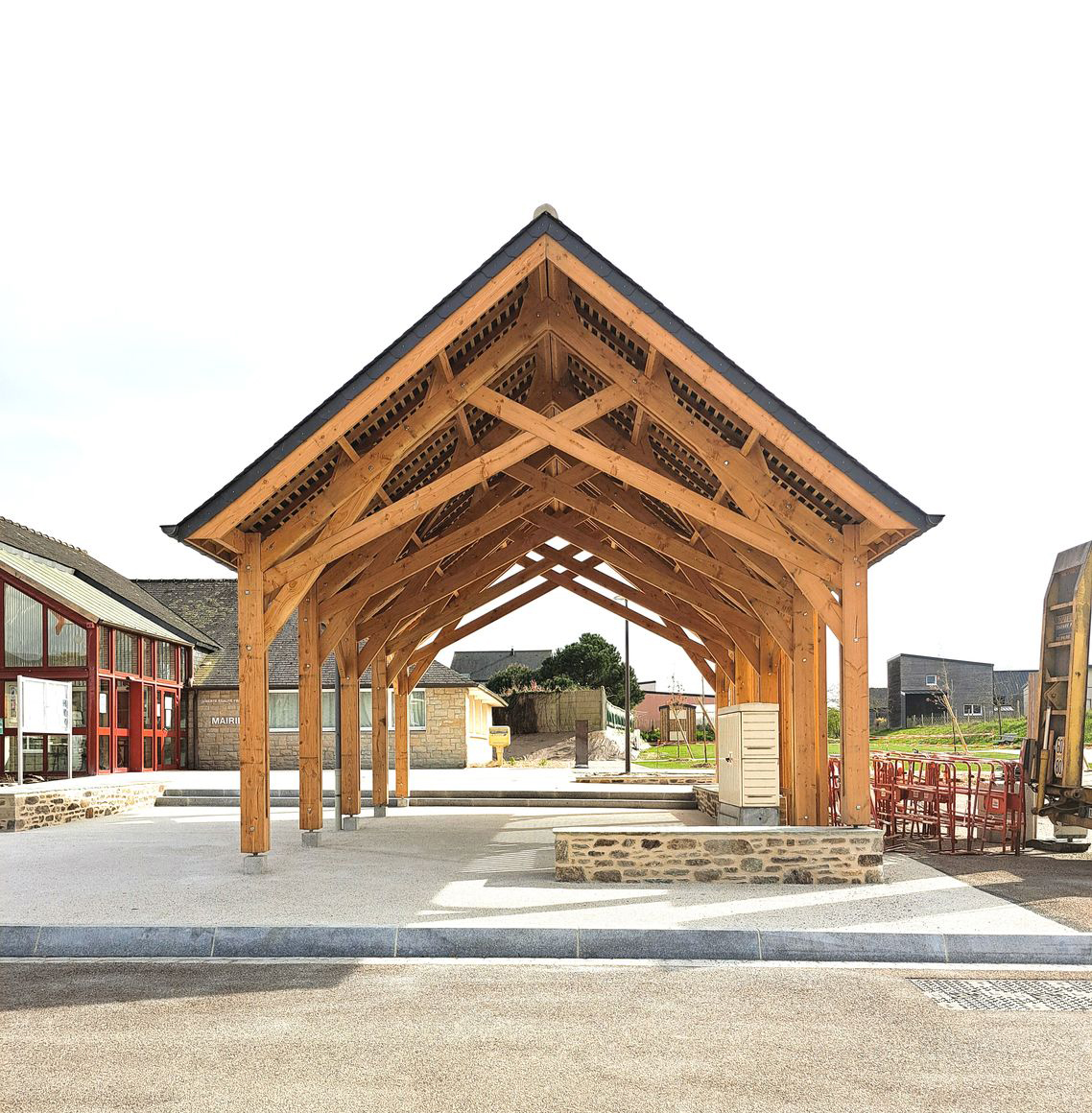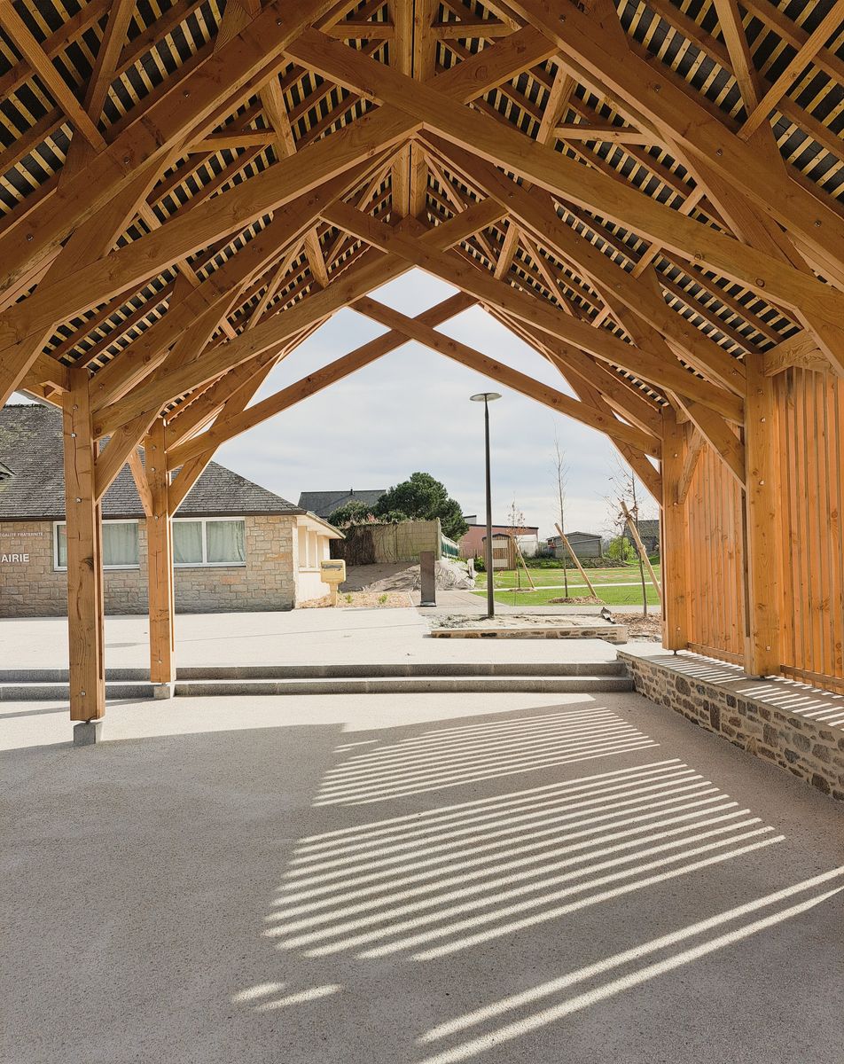 L’écriture architecturale s’appuie sur une lecture attentive du contexte local. La structure en bois massif apparente, les murets en pierre, l’emmarchement en granit et la toiture à deux pans en ardoise naturelle reprennent des matériaux et des formes familiers dans les bourgs des bords de Rance. Les fermes à ciseaux et les poteaux moisés donnent à l’ensemble une présence légère et lisible. Modeste dans son échelle, la halle affirme pourtant une vraie qualité d’usage et participe à donner une identité claire à cette nouvelle centralité villageoise.