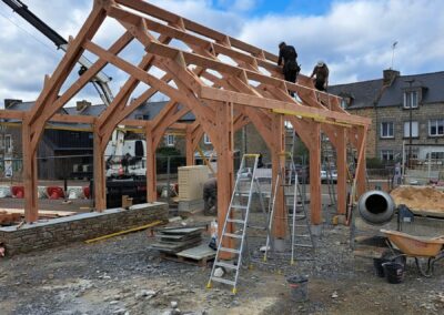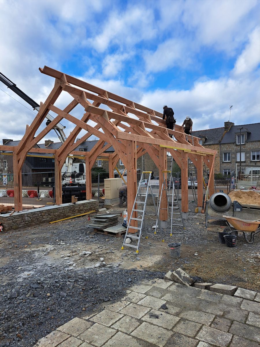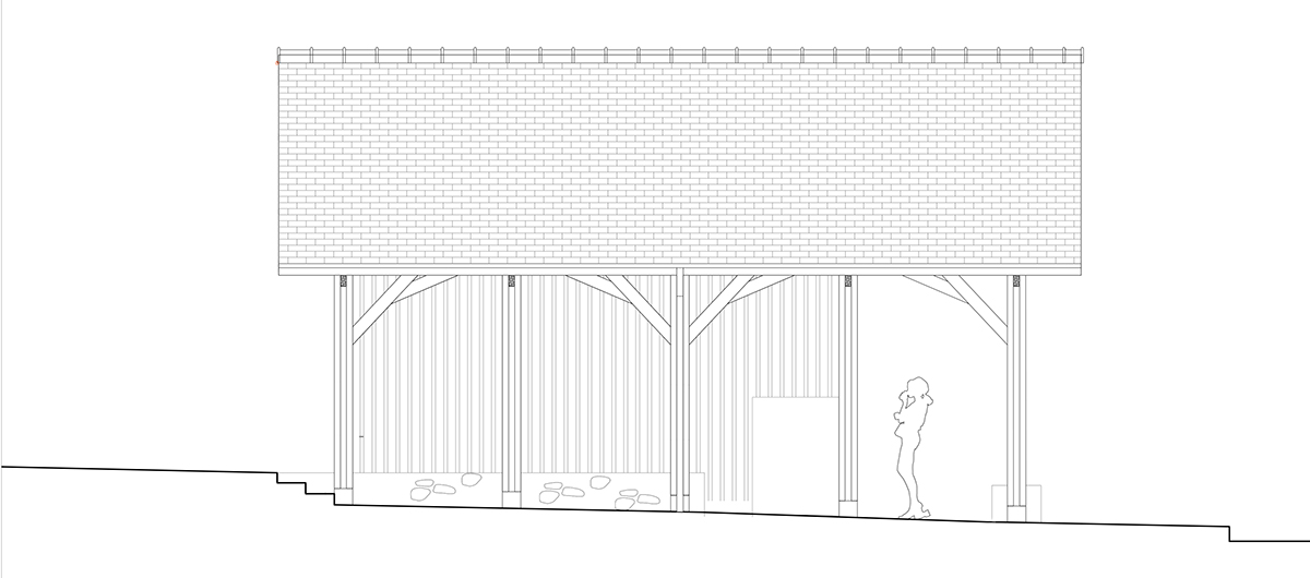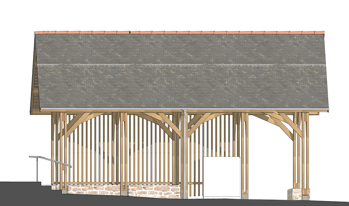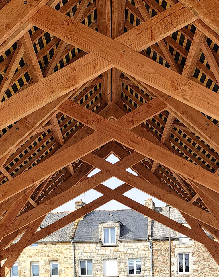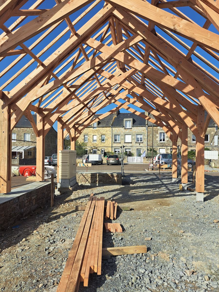 L’écriture architecturale s’appuie sur une lecture attentive du contexte local. La structure en bois massif apparente, les murets en pierre, l’emmarchement en granit et la toiture à deux pans en ardoise naturelle reprennent des matériaux et des formes familiers dans les bourgs des bords de Rance. Les fermes à ciseaux et les poteaux moisés donnent à l’ensemble une présence légère et lisible. Modeste dans son échelle, la halle affirme pourtant une vraie qualité d’usage et participe à donner une identité claire à cette nouvelle centralité villageoise.